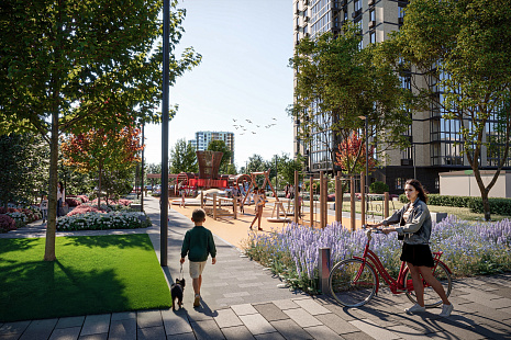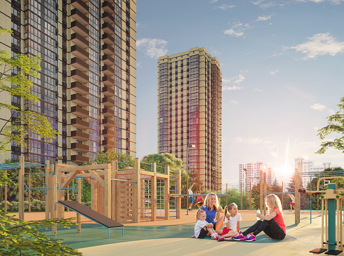 Оборудованные воркаут-зоны, игровые площадки, футбольные поля, волейбольные и баскетбольные площадки, велодорожки, идущие через всю территорию жилого парка